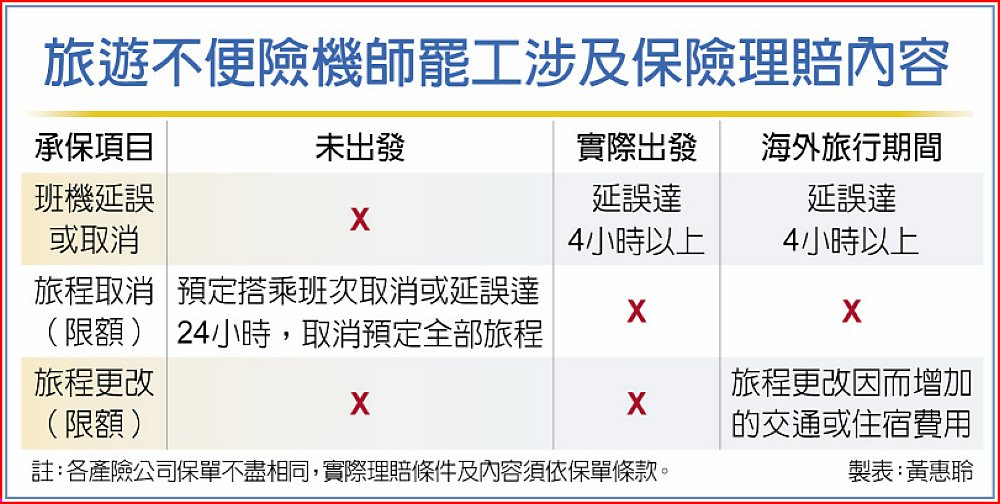 富邦產險、旺旺友聯產均表示,以「班機延誤險」為例,若在罷工事件宣布或發生前完成投保,因罷工事件造成預定搭乘班機延誤或取消,搭乘原訂班機或改搭其他班機,延誤達4小時以上,將依保單約定給付保險金。