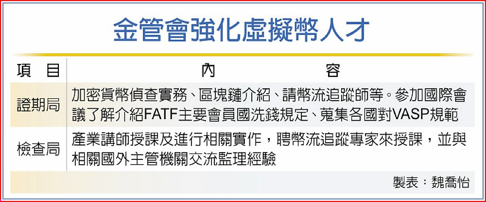 證期局說明,為強化監理專業,陸續針對負責業務的人員、主管安排教育訓練,包括加密貨幣偵查實務、區塊鏈介紹等,另外也會參加國際會議,了解介紹FATF主要會員國洗錢規定,及蒐集各國對VASP規範。
