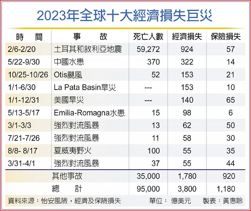 怡安風險最新調查報告顯示,2023年全球398起自然災害事件造成3,800億美元經濟損失,高於前一年(2022)年3,550億美元,且比21世紀平均高出2成以上,主要造成損失金額大增的原因在美國、歐洲發生的嚴重地震和強烈的對流風暴所致。