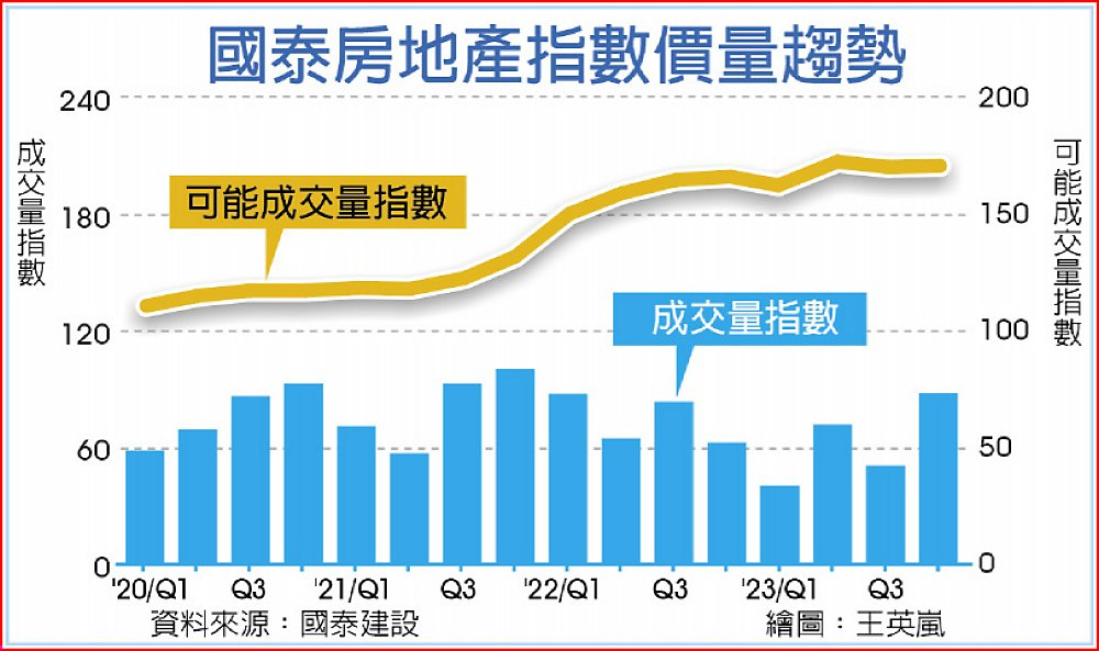 2023年第四季國泰房地產指數25日出爐,結果顯示,房市相較2023年第三季及2022年第四季,都呈「價穩量增」格局,顯示房市表現偏熱。