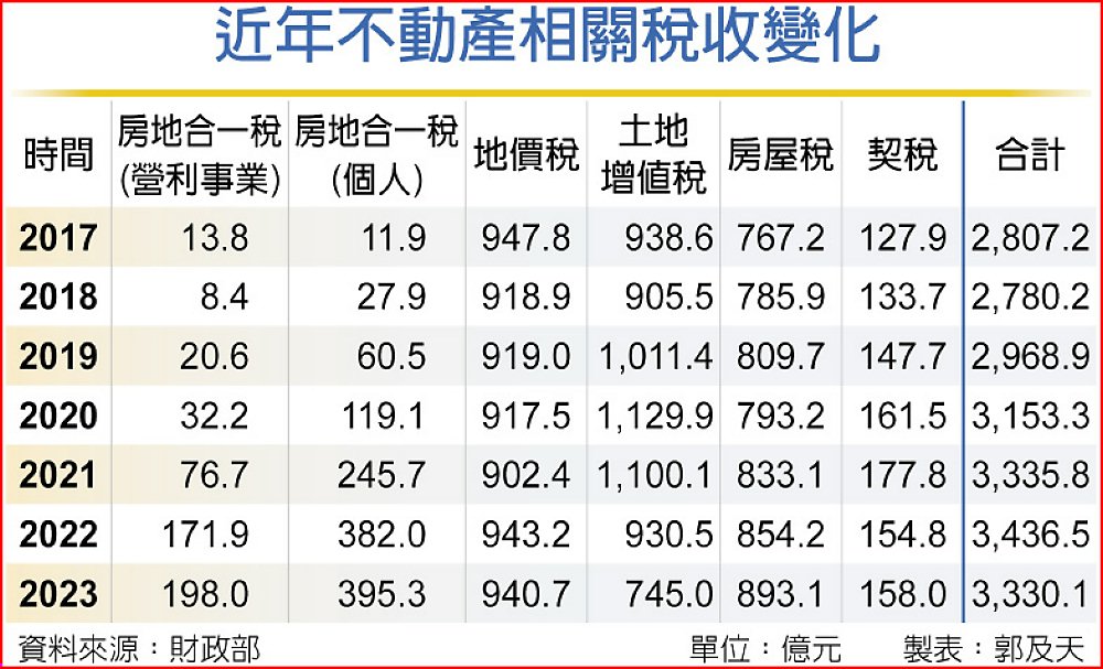 據財政部統計,包括房屋稅、地價稅、土增稅、契稅等四大稅收在2010年合計超過2,000億元,加上房地合一稅實施2017年起加入稅收行列,2020年不動產相關稅收突破3,000億元,迄2023年已是連續四年超過3,000億元。