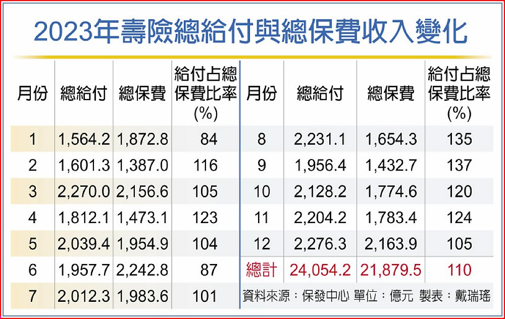 據保發中心統計,去年12個月中有10個月壽險給付高於總保費收入,即業務面的「資金淨流出」,代表壽險公司沒有新錢可加碼新的投資標的,但因為壽險資產逾33兆元,全年至少還有8,000億元的利息收入,還不算「入不敷出」。