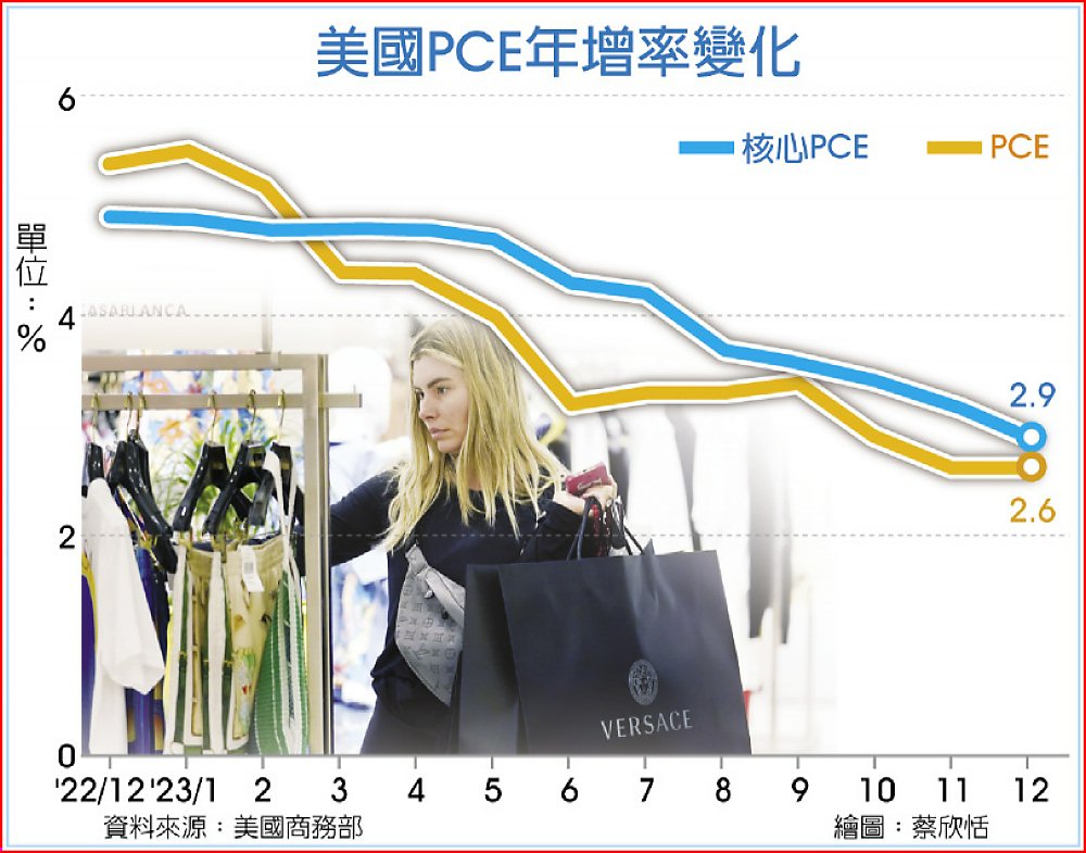 美國商務部26日公布,Fed偏好用來衡量通膨情況的2023年12月個人消費支出(PCE)物價指數年增率為2.6%,遠低於2022年底時的5.4%。至於扣除波動性較大的食品與能源項目,12月核心PCE年增2.9%,增幅創下2021年3月以來最低。