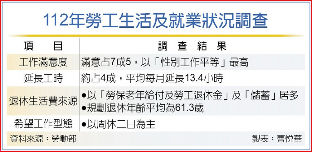 為了解勞工工作狀況、對工作環境的滿意及職涯規劃等情形,勞動部以參加勞保的本國勞工為調查對象,按年辦理「勞工生活及就業狀況調查」,去年計回收有效樣本4,095份。