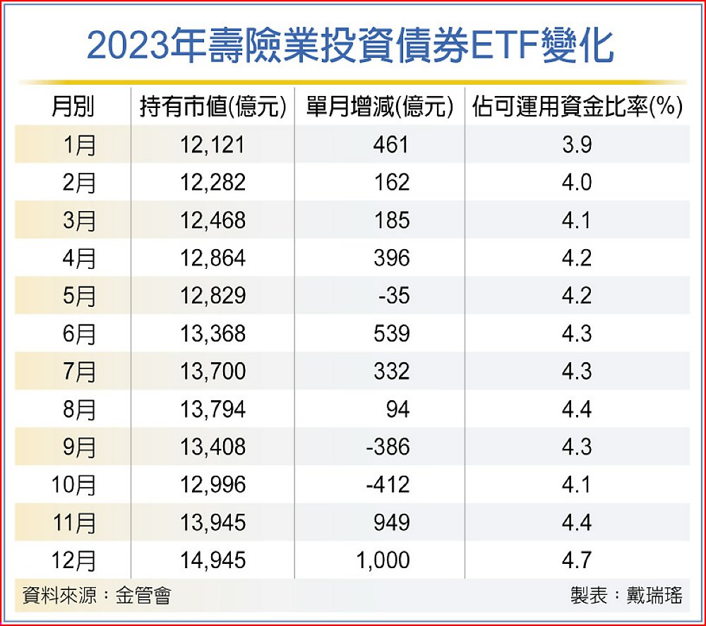 隨著市值增加,去年壽險業持有債券ETF占可運用資金比重上升,2022年底還不到4%,去年底已提高到4.7%,但還未超過2020年的比重最高4.8%。
