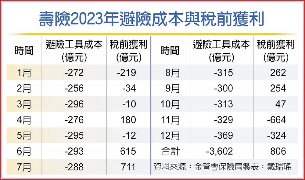 壽險去年光避險工具成本就耗資達3,602億元,創下史上新高,這筆錢如投入水中一去不回,去年自8月開始連續5個月單月花超過300億元。圖/本報資料照片