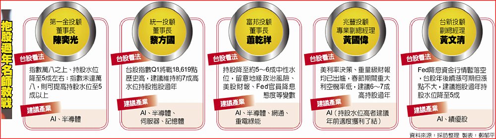 封關在即,年前最後操作見真章,綜合第一金投顧董事長陳奕光、統一投顧董事長黎方國、富邦投顧董事長蕭乾祥、兆豐投顧專業副總經理黃國偉、台新投顧副總經理黃文清等五位名師看法,投資人抱股過年持股水位建議落在5~7成,並把握逢高獲利入袋漲多股、資金轉進低基期且產業展望轉佳股「操作兩原則」,卡位龍年行情。