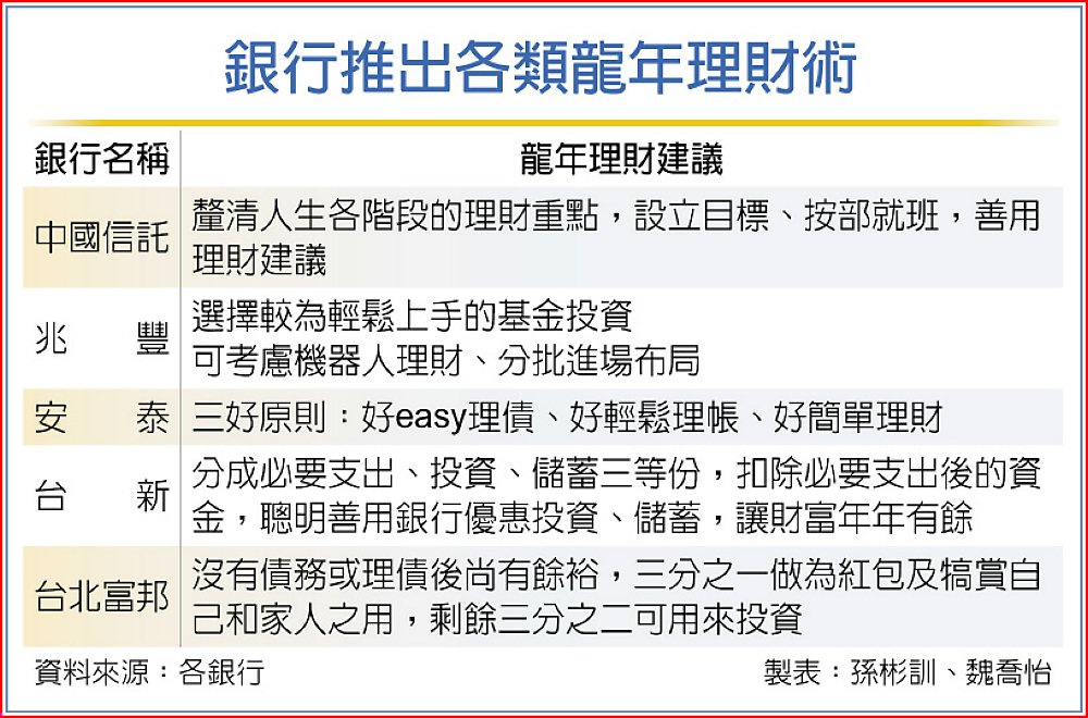 台新銀行則強調,民眾要將年終獎金放大,應分成必要支出、投資、儲蓄三部分,再扣除必要支出後的資金,記得聰明善用銀行優惠進行投資、儲蓄,讓財富年年有餘。民眾可視需求妥善運用資金理財,運用時間複利打造穩定金流,搶得財富先機,於金龍年財運大發。