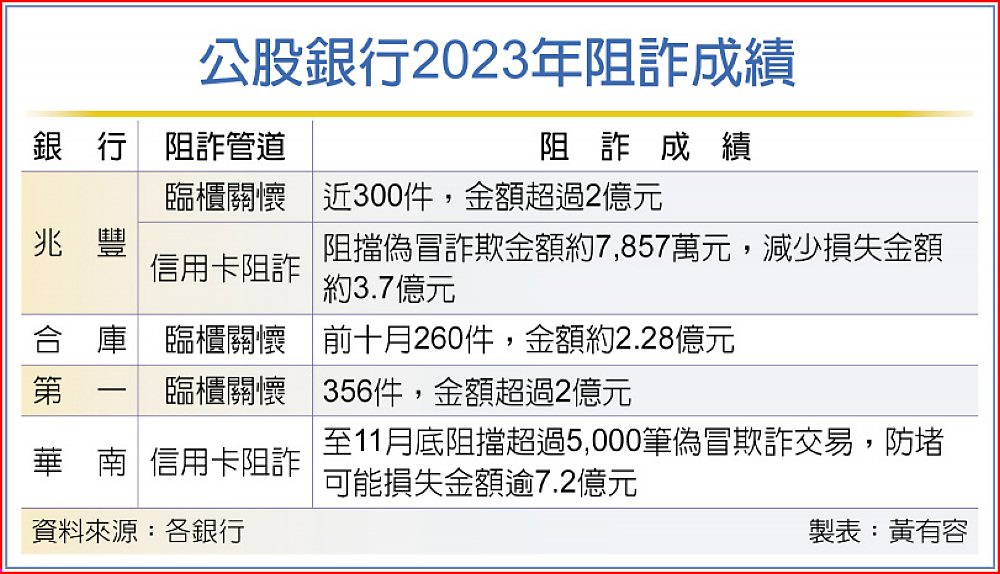 第一銀行落實臨櫃關懷方面,去年全年成功攔阻詐騙案件共計356件,金額超過2億元,年成長逾6成;華南銀行去年成功阻擋超過5,000筆偽冒欺詐交易,防堵可能損失逾7.2億元;合庫銀行臨櫃關懷去年前10月即攔阻260件,金額約2.28億元,攔阻件數年增56件或27%,攔阻金額年增1.09億元或92%。
