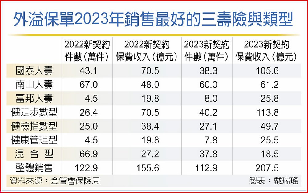 隨著壽險公司大力推動,2023年外溢保單共銷售近113萬件,相較2022年123萬件,雖年減約8%,但新契約保費持續成長至207.48億元,較2022年的155.6億元,年增近52億元或33%。