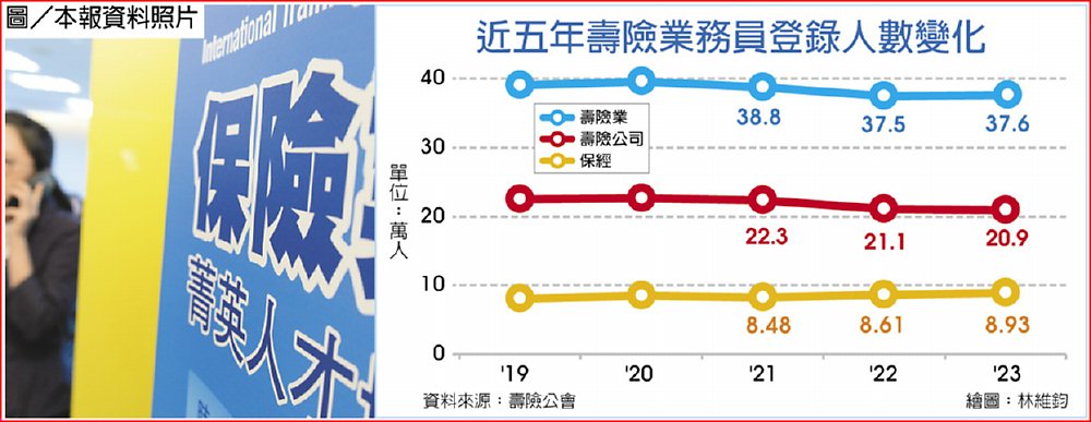 整體壽險業務員總登錄人數(即壽險公司、保經、保代合計)在2020年底曾一度逼近40萬人,達39.6萬人,2021年就碰上新冠肺炎疫情,業務員無法面對面銷售,壽險業務員總登錄人數從2021年一路下滑,2022年跌到37.53萬人,比2021年大減超過1萬人。