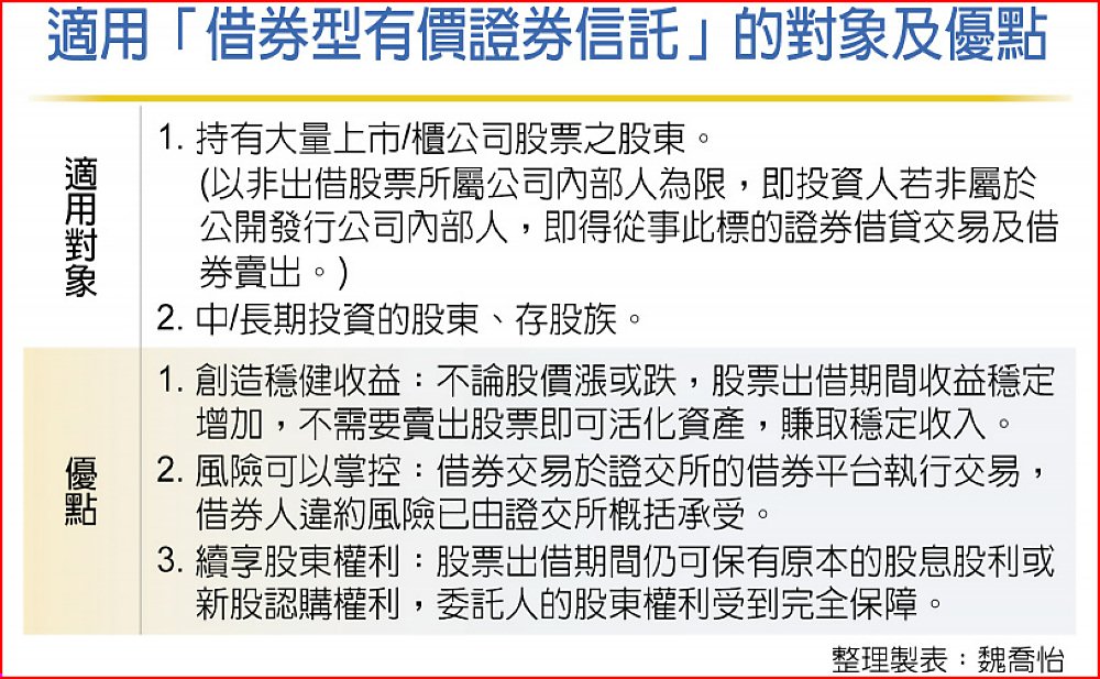 信託公會秘書長呂蕙容指出,目前國內信託業所辦理的有價證券信託業務中,以受託人依信託契約約定代為運用方式的「借券型有價證券信託」、委託人保有運用決定權的「本金自益、孳息他益」,或具有傳承規劃的「本金他益、孳息自益」的規劃最為常見。