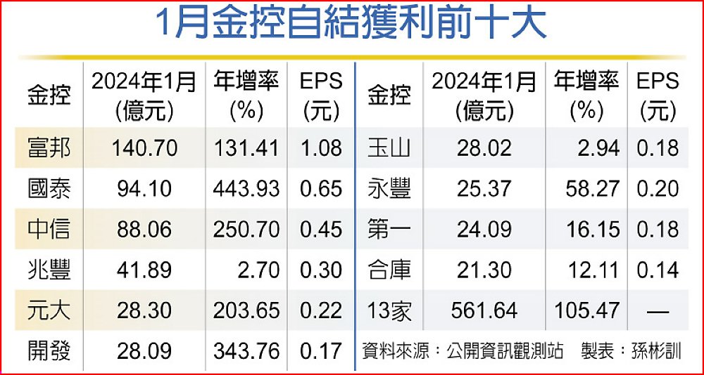 13家金控1月獲利第一名是富邦金140.7億元,國泰金94.1億元居次,第三名中信金88.06億元,公股龍頭兆豐金也有41.89億元。其他元大金、開發金、玉山金、永豐金、第一金、合庫金等都超過20億元。獲利年增率方面,國泰金高達443.93%表現最亮眼,其次是開發金343.76%,中信金250.7%、元大金203.65%、富邦金131.41%,共五家獲利翻倍,至於13家合計獲利年增率皆正數。