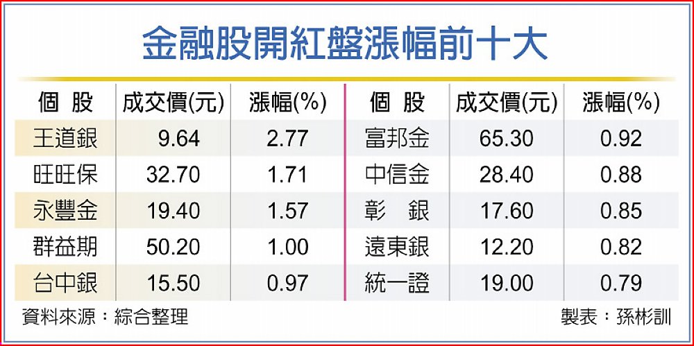銀行相關個股漲勢較為凌厲,保險相關的旺旺保、開發金表現也在前段班,拿下今年元月首勝的金控獲利王富邦金也展現氣勢,帶動金融股上攻。