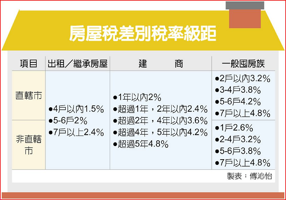 至於出租和繼承房屋是依戶數分三級課稅,並不會因房屋所在地位於直轄市或非直轄市而不同,四戶以內稅率1.5%、五至六戶稅率2%、七戶以上則適用2.4%稅率。