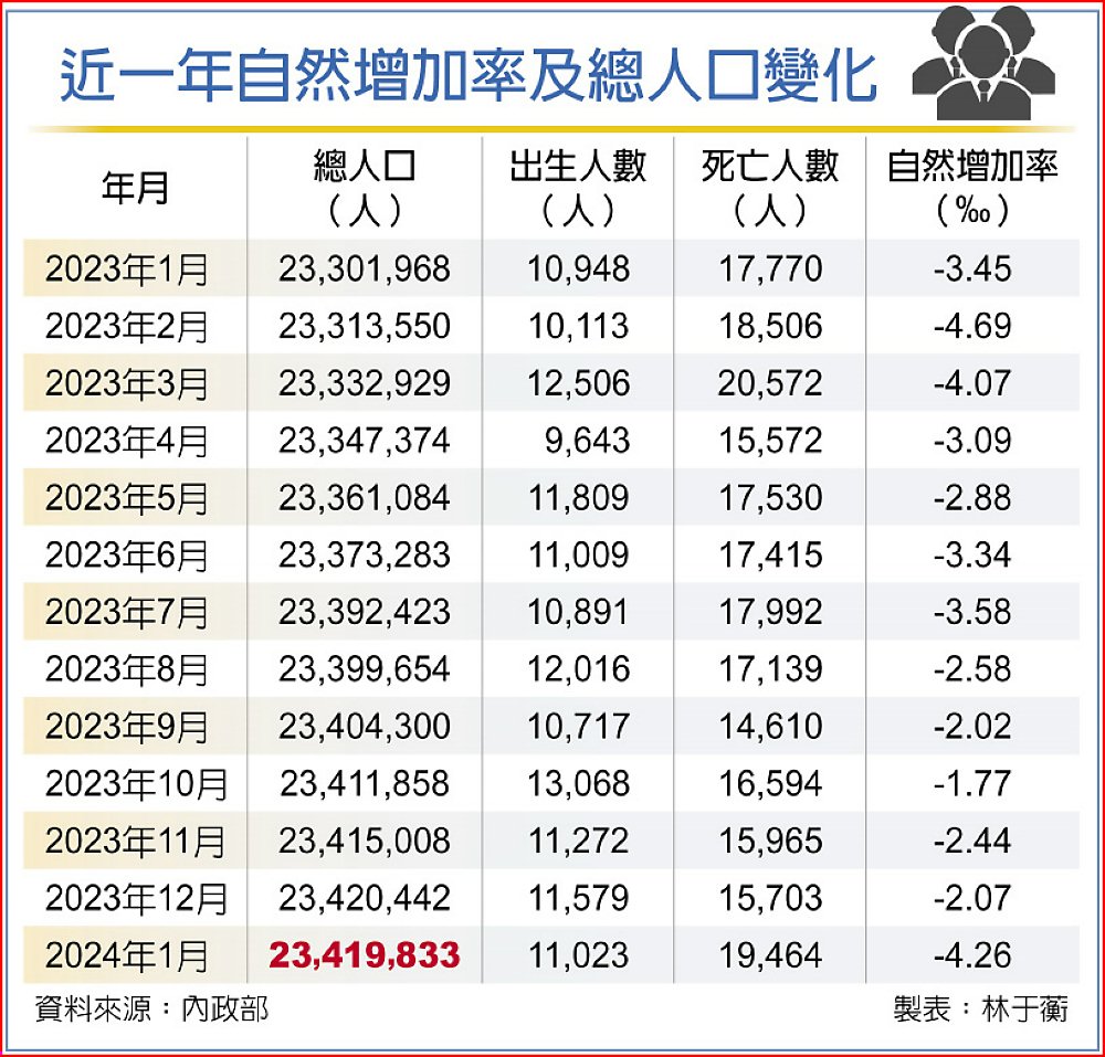 內政部指出,今年1月出生數為11,023人,約每四分鐘出生一個嬰兒,1月死亡數為19,464人,平均約每2.3分鐘死亡一個人。僅連江縣1月的出生人數超過死亡人數,但也僅多出9人,其他縣市都是死亡多於出生人數。