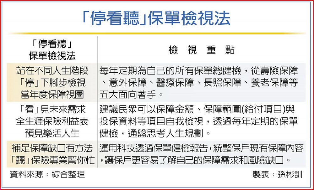 富邦人壽表示,建議用「停看聽」保單檢視法,定時留意自己的投保狀況,因應不同人生階段適時調整與補強。