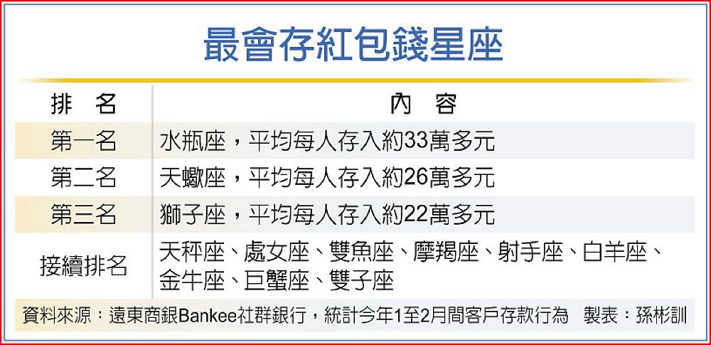 遠東商銀Bankee社群銀行從今年1至2月間客戶存款行為統計分析,思想創新且愛好自由的水瓶座,是12星座中存入金額最高的星座,平均每人存入約33萬多元;第二名則是敏銳度較高的天蠍座,平均每人存入約26萬多元;第三名是行動力較強的獅子座,平均每人存入約22萬多元。接著依序為天秤座、處女座、雙魚座、摩羯座、射手座、白羊座,最後三名則是金牛座、巨蟹座、雙子座。