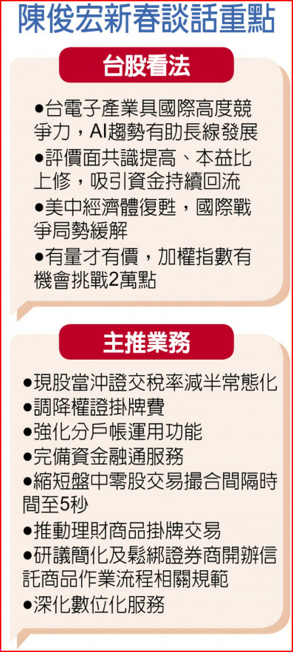 券商公會除了力推「現股當沖證交稅率減半常態化」之外,今年也將促成「調降權證掛牌費」、「完備資金融通服務」、「強化分戶帳運用功能」、「縮短盤中零股交易撮合間隔時間至5秒」、「推動理財商品掛牌交易」、「研議簡化及鬆綁證券商開辦信託商品作業流程相關規範」,以及「深化數位化服務」。