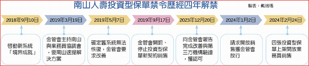 南山人壽2019年因更換新核心系統「境界成就」接軌不順,遭金管會限制業務,停止投資型保單新契約銷售,一禁就是四年,在境界系統改善,並完成第三方查核驗證後,金管會今年認可南山人壽完成改善,1月初開放可恢復銷售投資型保單。