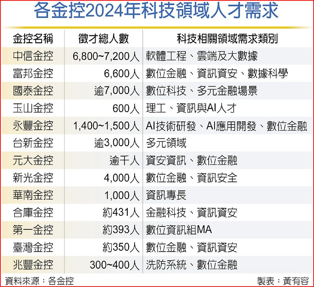 各金控2024年科技領域人才需求