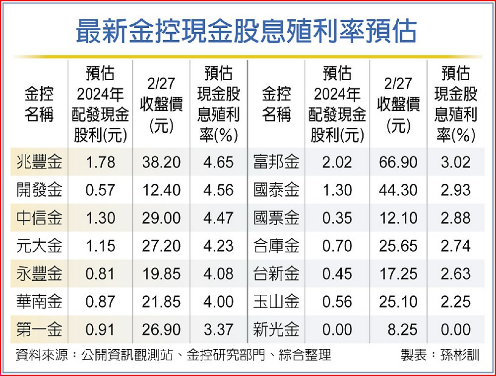 此外,第一金、富邦金預估現金股息殖利率在3%以上,其他金控也都有2.25%以上,都可打敗一年期新台幣定存。