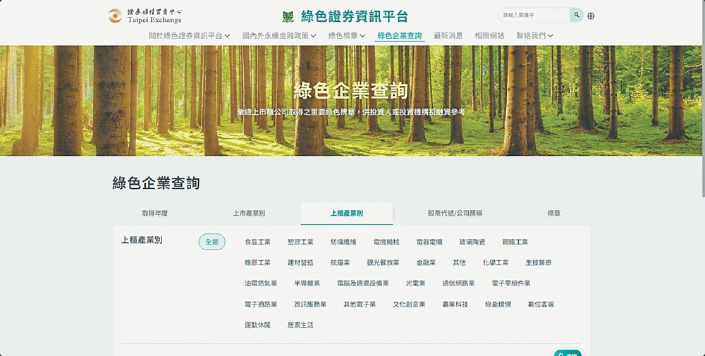 有關該平台中「綠色標章」部分,係國內資本市場新設彙整上市櫃公司綠色成就相關資訊之資料庫,主要係篩選出國內外具公信力單位認證核發、符合一定綠色標準之標章共28項(國內9項、國外19項),分為第一類環保標章、特定主題環保標章、綠色工廠標章及清潔生產評估系統認證等三大類,並彙總上市櫃公司取得標章之情形,供使用者依公司別、產業別、標章別等各面向進行一站式查詢。