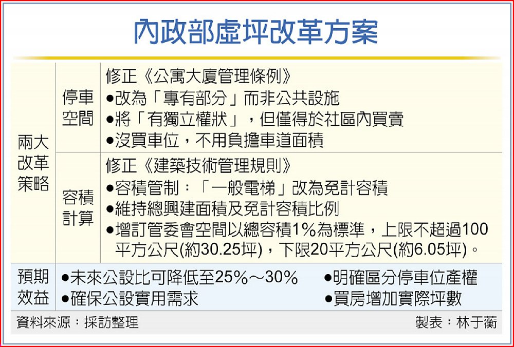 在容積改革部分,內政部將修正《建築技術管理規則》,將「一般電梯」從現行的「應計容積」改為「免計容積」,藉以壓縮原本在免計容積中「管委會空間」的浮濫擴張,並明定以總容積1%為原則,只能設置20~100平方公尺(約6.05~30.25坪)的管委會空間,讓公共設施回歸實際合理使用。