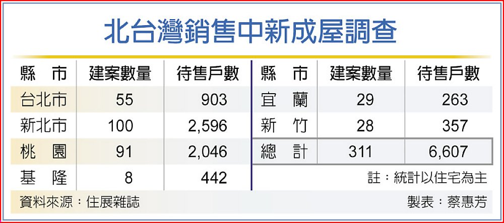 調查指出,北台公開銷售中的住宅新成屋案共311案,合計待售戶數約6,607戶,其中新北以100案居冠、待售戶數約2,596戶,其次為桃園新成屋91案、待售戶數約2,046戶。