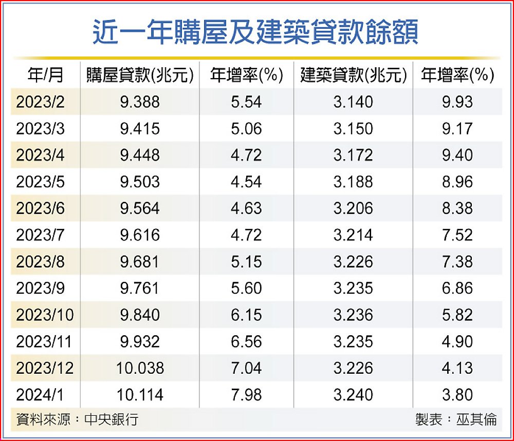 央行官員強調,建築貸款除工程款外,也包括周轉金貸款,建築貸款餘額止血上升,主要應是農曆年關前建商有資金需求,要把款項結清,因此有較高資金需求,「不一定是開新案」;且從內政部開工宅數、使用執照及核發建照數據,在年關前都還是繼續往下走,整體建商對未來看法仍是相對審慎。