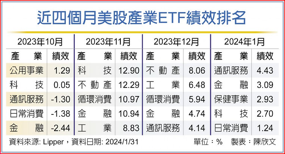 美股今年以來一路走高,法人看好長線投資機會,但美股產業輪動快速,據統計,過去四個月美股表現最佳跟最差的族群,落差極大,今年首月美股通訊服務表現最佳達4.43%,但去年第四季,10月為公用事業類領先,11月科技類股一枝獨秀,績效高達12.90%,12月則由不動產產業8.06%居冠。投資人想要掌握績效最優的產業相對困難。