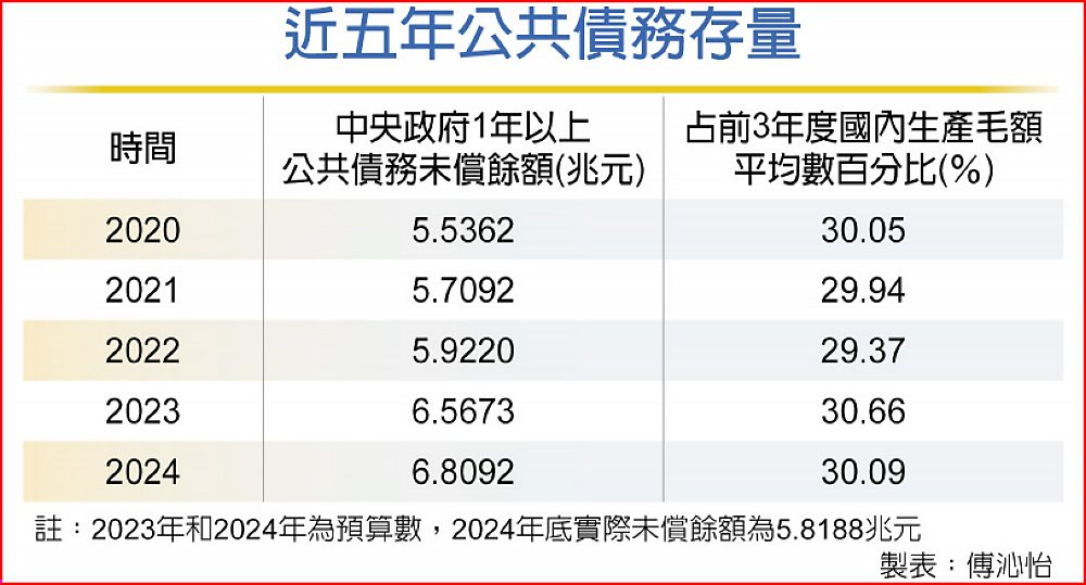 今年底中央政府1年以上公共債務未償餘額如依預算數達6兆8,092億元,占前3年度名目國內生產毛額GDP平均數將提高至30.1%,可能創下近五年新高水準,但仍符合公共債務法債務存量40.6%的上限規定。
