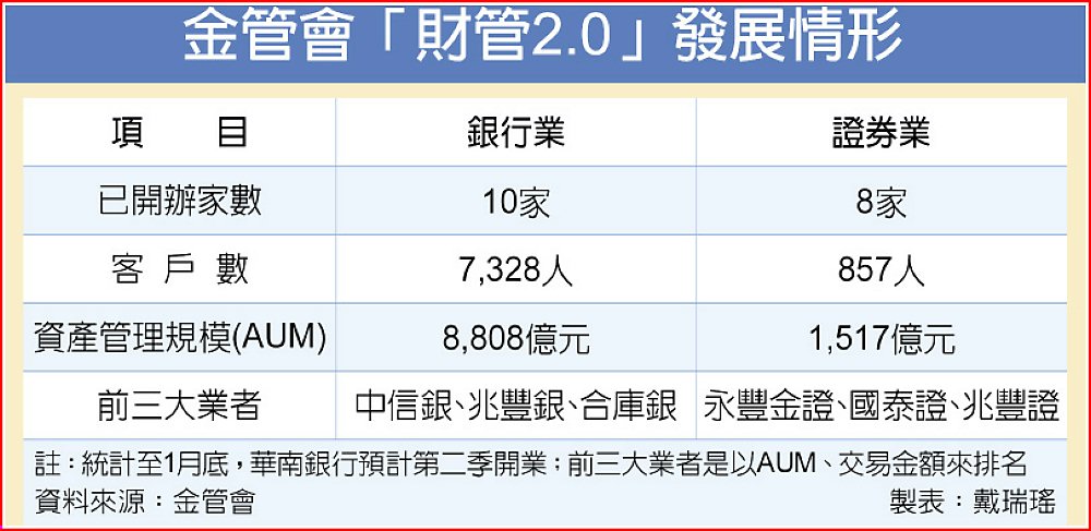 金管會在2020年開放「財管2.0」,目前已核准中信、上海、兆豐、國泰世華、第一、合庫、瑞銀台北分行、玉山銀行、台北富邦銀行、元大銀行、華南銀行等11家辦理,除華南銀還未開業外,其他十家都已開業。