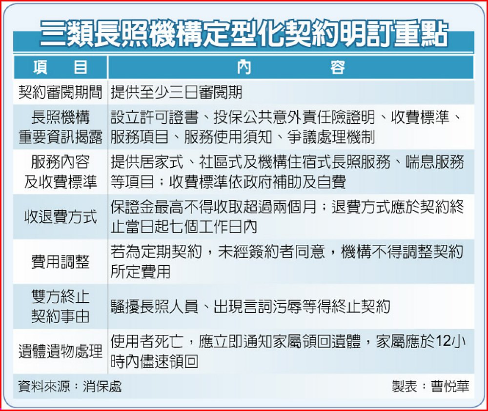 消保處進一步說明,契約規範計有七項重點,包含契約及附件原則應經簽約者攜回審閱至少三日;明定長照機構重要資訊揭露,長照機構應將設立許可證書、投保公共意外責任險證明(居家式除外)、收費標準、服務項目、服務使用須知,與爭議處理機制等重要資訊,揭示於長照機構內明顯處所,並主動提供消費者參閱。