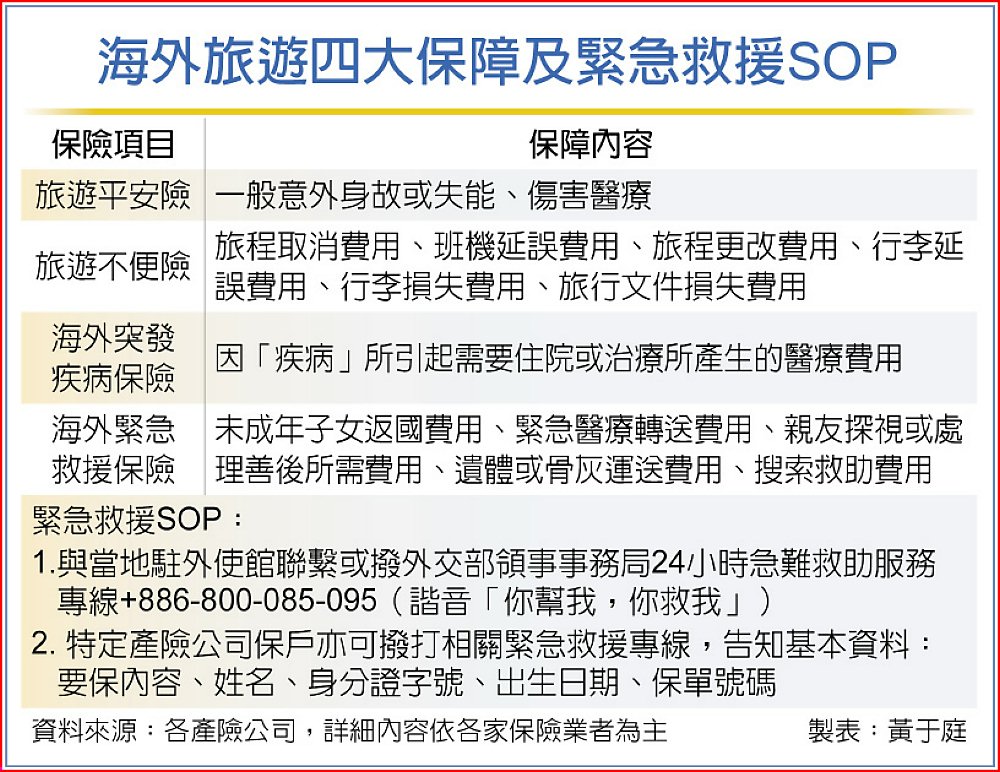 明台產險表示,一般民眾常聽到的旅平險是意外事故所造成的人身傷害保險,如果是想要保障旅程取消或更改、班機延誤、行李延誤或損失、旅行文件損失等意外,則建議加保旅遊不便險,想要有更完善的保障,還可以再加保海外突發疾病和海外緊急救援保險,因應疾病產生的醫療費用,總投保方案金額由100萬元~1,000萬元不等,可視個人需求投保。