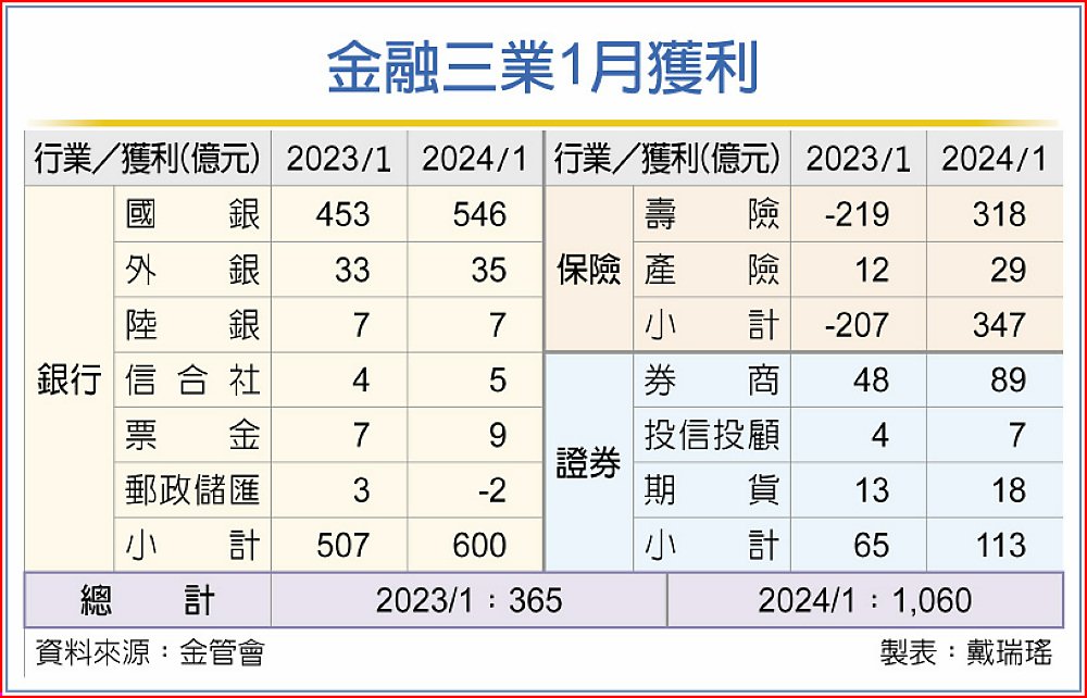 受惠美國聯準會(Fed)降息預期,美元走貶、新台幣升值,同時股債市走穩,金融三業1月稅前獲利1,060億元,比去年同期365億元,年成長1.9倍之多,尤其保險業由虧轉正,證期三業(證券、投信投顧與期貨)獲利成長最大、年增超過7成,銀行業持續維持穩定獲利、年增近2成。