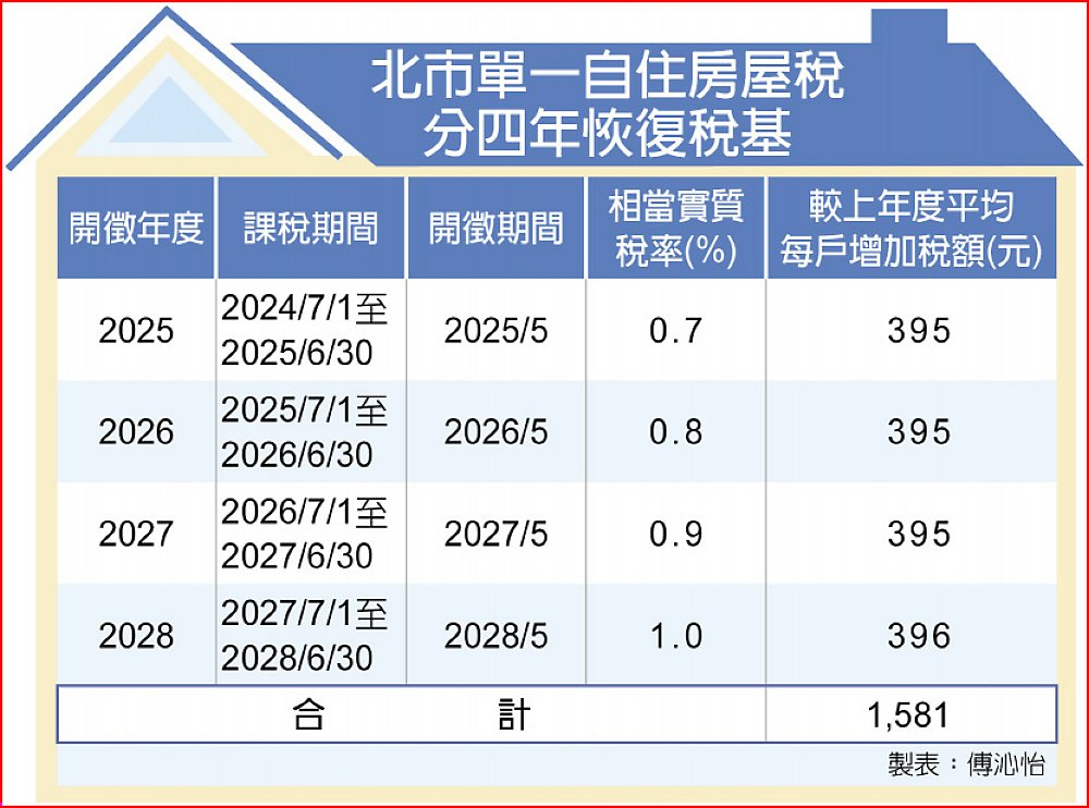 依台北市政府預估,原享有單一自住稅基折減的納稅人,在逐年調整0.1%的過程中,每年每戶平均約增加房屋稅稅額395元,四年後恢復1%的稅率之後,如果相較原本的0.6%,等於則是未來每年都會多出1,581元房屋稅稅金。