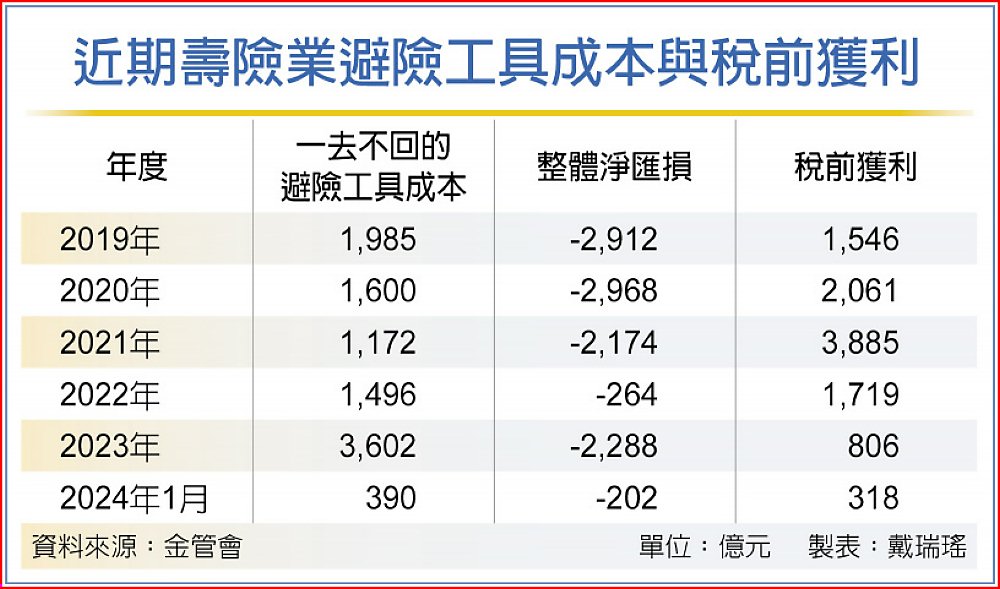 壽險業去年光花在換匯(CS)、無本金遠期外匯(NDF)等成本高達3,600億元,此資金「一去不回頭」,今年1月又花390億元,估計全年將逾4,600億元,壽險業者認為接軌在即,增資都來不及,還要每年花數千億元給外銀買避險工具,不如留在帳上,厚植資本。