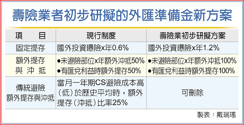壽險業提案將提存率拉高到一年1.2%,但沖抵率亦拉上100%,直到準備金為零,但有匯兌利益時亦增提100%,並可申請額外增提。