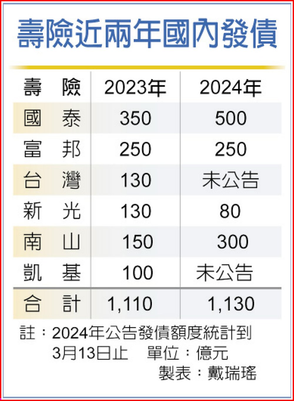 因市場胃納量有限,越晚發債票面利率就越高,各公司都打算先搶先贏,第一季還沒結束,已有四大壽險搶發債,合計高達1,130億元,超過去年的1,110億元;近十年壽險發債超過千億元只有過兩次,即2016年1,040億元,及去年的1,110億元。