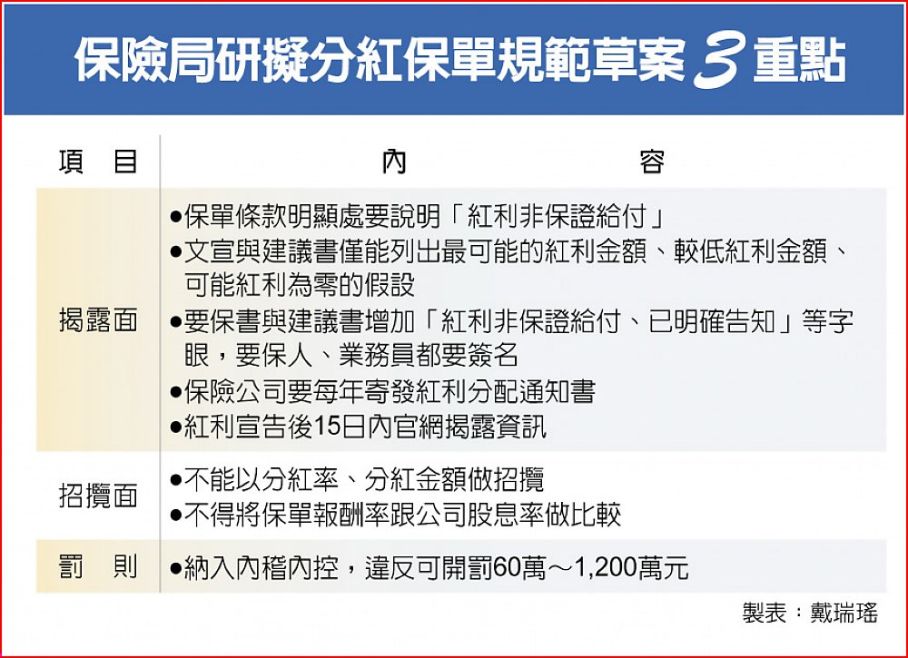 就目前保險局擬訂的草案,首先在「揭露面」上,分紅保單的保單條款,要在明顯處說明「紅利非保證給付」,在宣傳文宣與建議書上,僅能列出最可能紅利金額、較低紅利金額、可能紅利為零的假設。現行分紅保單文宣上會公布中、高、低分紅假設,未來將不得公布「高分紅」假設,以免讓保戶有過高且實現不了的期待。
