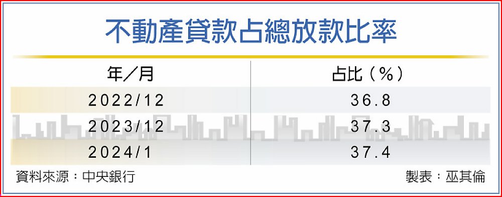 依央行書面報告的資料顯示,不動產貸款占總放款比率居高,1月底為37.4%,高於2022年底的36.8%,等於自央行實施房市管制以來,不動產貸款集中度不降反升。