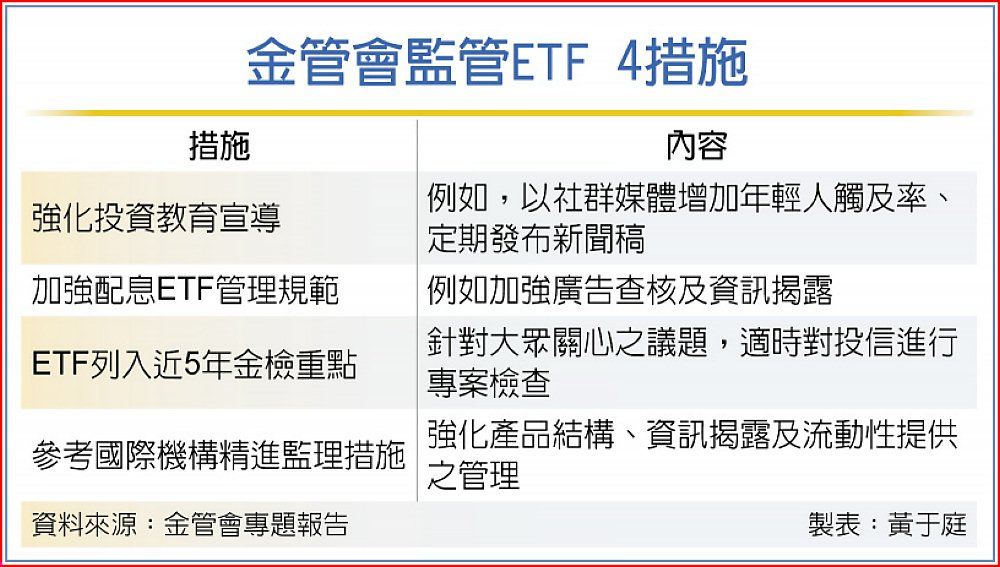 金管會強調,政策會持續強化保障投資人權益措施。具體而言,近5年均將ETF列為年度檢查重點,今年1月已對ETF承作量較多的投信公司,辦理專案檢查,檢查重點包含募集銷售、配息政策、收益平準金使用原則、配息組成占比揭露、折溢價管理、追蹤指數、資訊揭露及廣告行銷等項目。