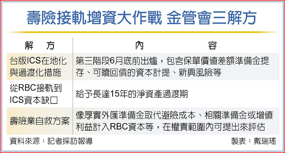 第二,針對壽險在接軌當下的增資壓力,主要是從RBC 200%接軌到ICS 100%的資本缺口,去年已公告,會給予15年的淨資產過渡期。現在除新壽、三商壽兩家壽險公司資本適足率(RBC)不到200%外,其他壽險公司的RBC都在200%之上,在接軌前RBC逾200%的公司,屆時都可適用15年過渡期。