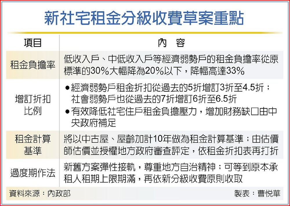 內政部表示,新租金方案能夠充分考量社宅承租人負擔能力,將低收入、中低收入等經濟弱勢戶的租金負擔率從原標準的30%大幅降為20%以下,降幅高達33%。
