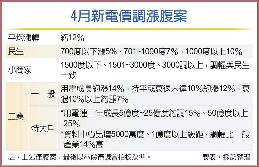 特別的是,這次會將全球網路資料中心(IDC)特別單列討論,因其用電漲幅比一般產業高。至於特大戶用電50億度以上的台積電,將適用最高漲幅25%;一般工業用電漲幅落在7~14%。