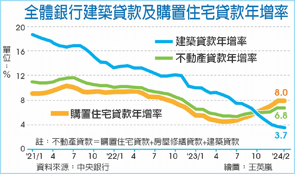 央行揭露2020年12月底祭出管制措施以來,有二成效,一是整體銀行建築貸款年增率持續走緩,自2021年1月的18.7%,2023年7月降至7.5%,而在2024年2月更已降至3.7%。