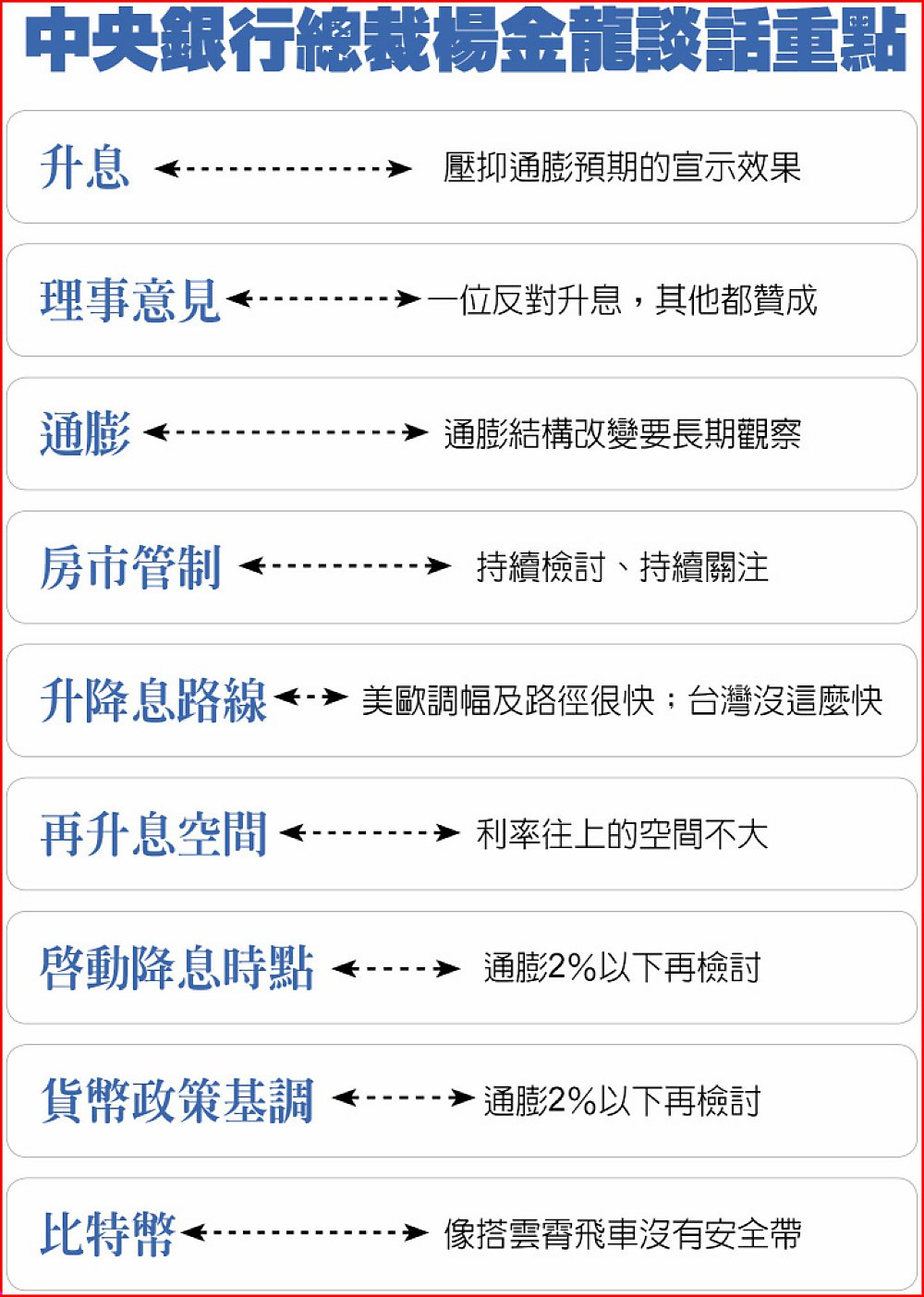 楊金龍說,央行從2020年12月以來,五度調整選擇性信用管制措施,有助銀行控管不動產授信風險,避免信用資源過度流向不動產市場。同時,央行2022年3月起開始升息,就是採行漸進的緊縮貨幣政策,亦有助強化選擇性信用管制措施成效。