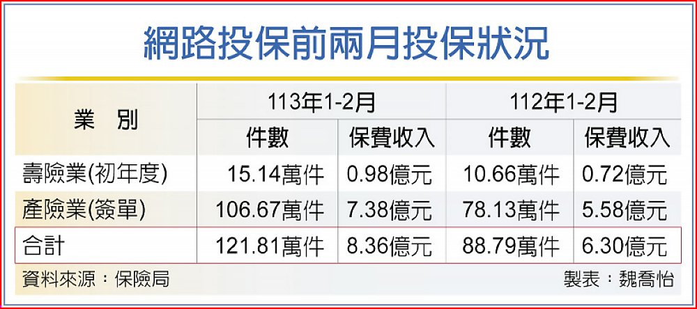 金管會統計顯示,今年1、2月產險、壽險整體網路投保件數達121.81萬件,年增37%;保費收入達8.36億元,年增率33%,投保熱絡。產險業最熱銷的險種包括機車保險、旅綜險(含旅遊不便險)、汽車保險,投保件數分別達24.81萬件、23.37萬件、15.89萬件,都比去年同期成長。銷售業績最好的是富邦產險、新安東京海上、國泰產險。