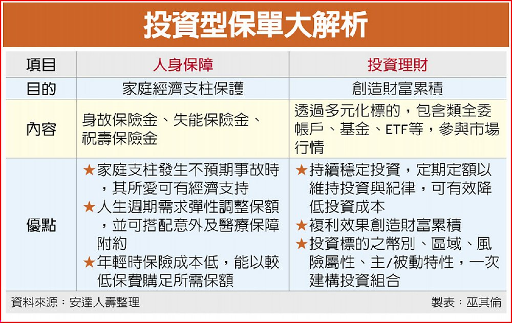 投資型保單主要功用,在於協助保戶達到家庭經濟支柱保護,以及創造財富累積之目的。安達人壽表示,投資型保單的人身保障部位,內容多以壽險為主,包含身故保險金、失能保險金,或祝壽保險金。保戶可在設定投資理財目標情況下,兼顧壽險保障以轉嫁風險給保險公司。